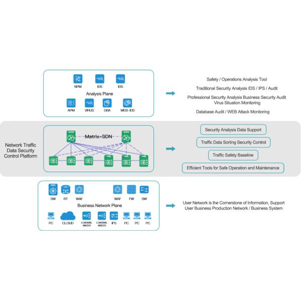 Traditional traffic data control usually deploys the network management system as the management plane, and the control plane and data plane are distributed to run on each device.The traffic path adjustment needs to be achieved by configuring the traffic strategy on the acquisition unit. However, the traffic adjustment of a large network is not only tedious, but also prone to failure and complicated operation and maintenance.Because the control surface of the equipment is closed in the traditional network, the deployment of a new function may lead to a long cycle.And if the equipment software needs to be upgraded, it also needs to be operated on each device, which greatly reduces the work efficiency.